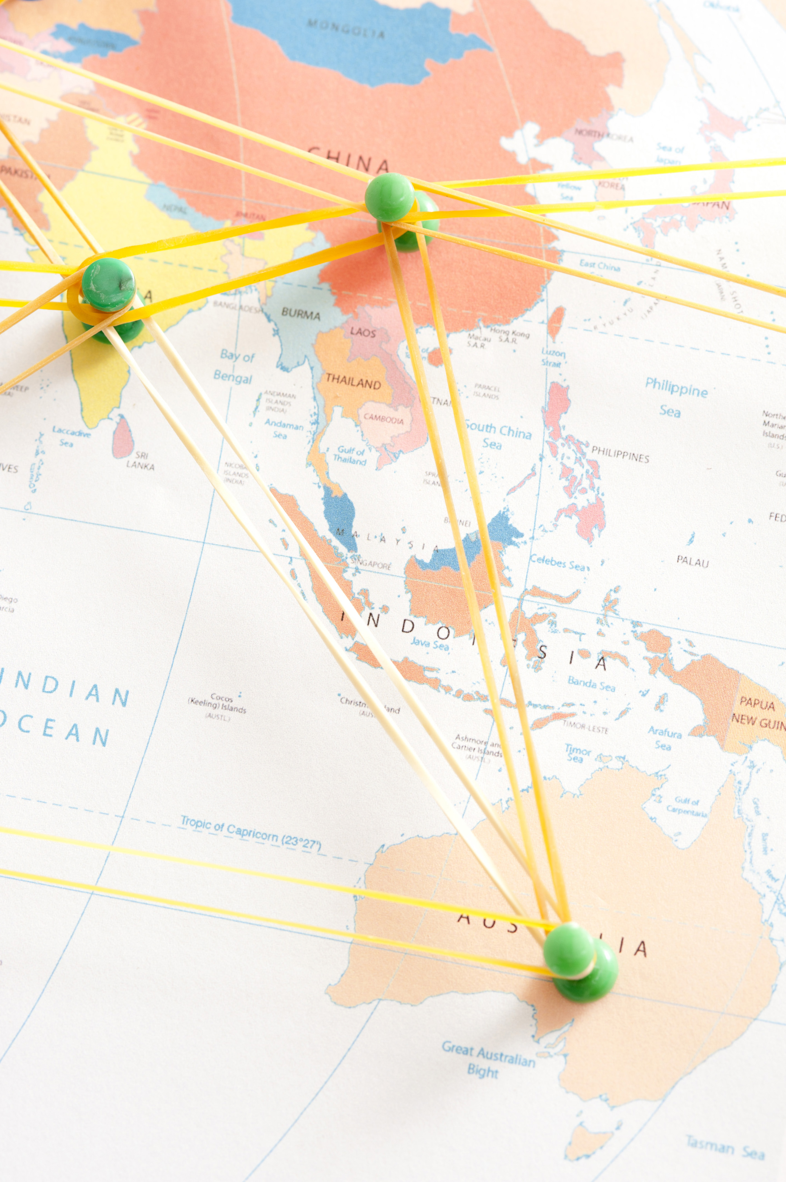 asia australia australisia concept connected international map network pin communication connection elastic global rubber band destination