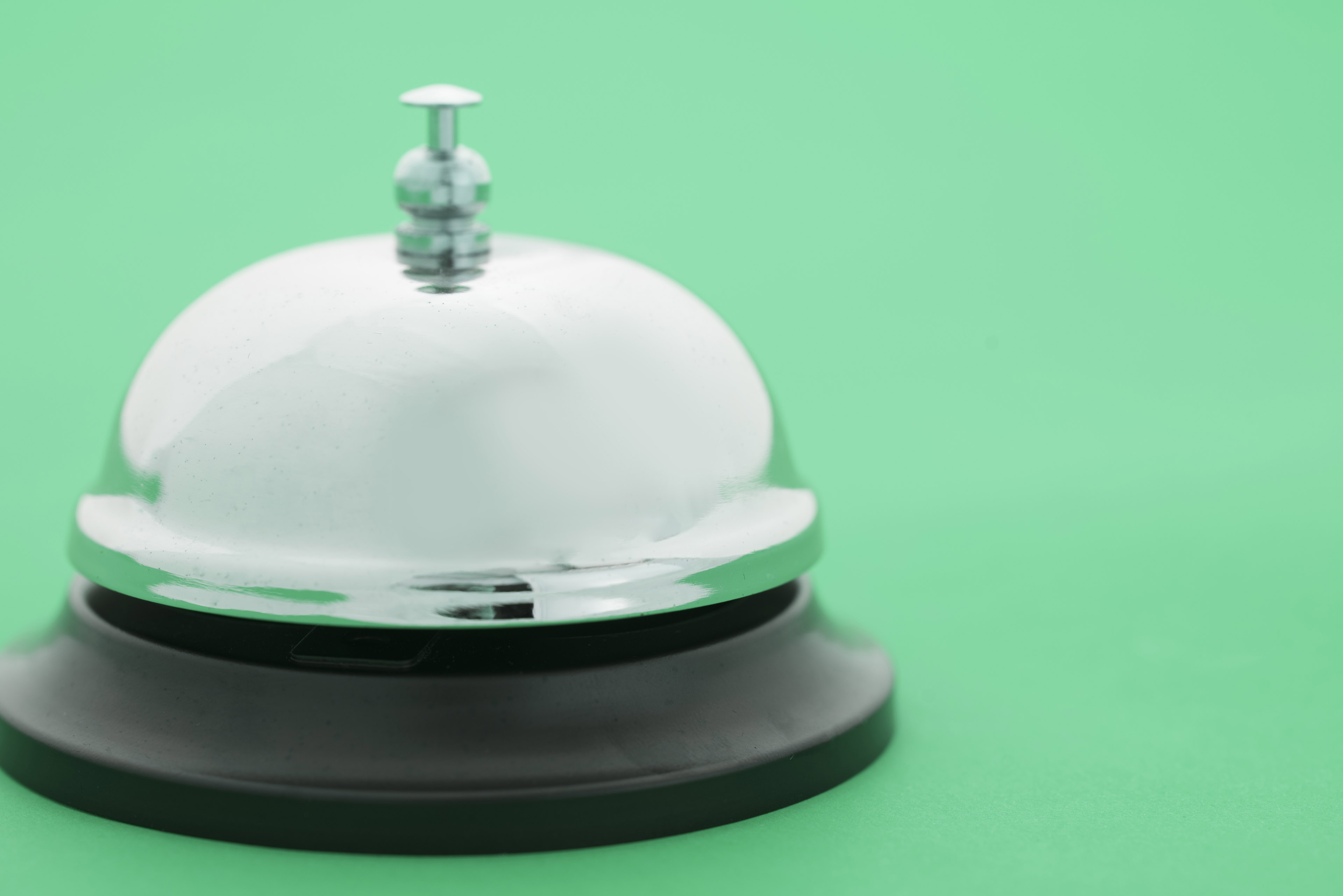 assistance attention bell help hotel metal service silver ring copy space domed push closeup shiny side green