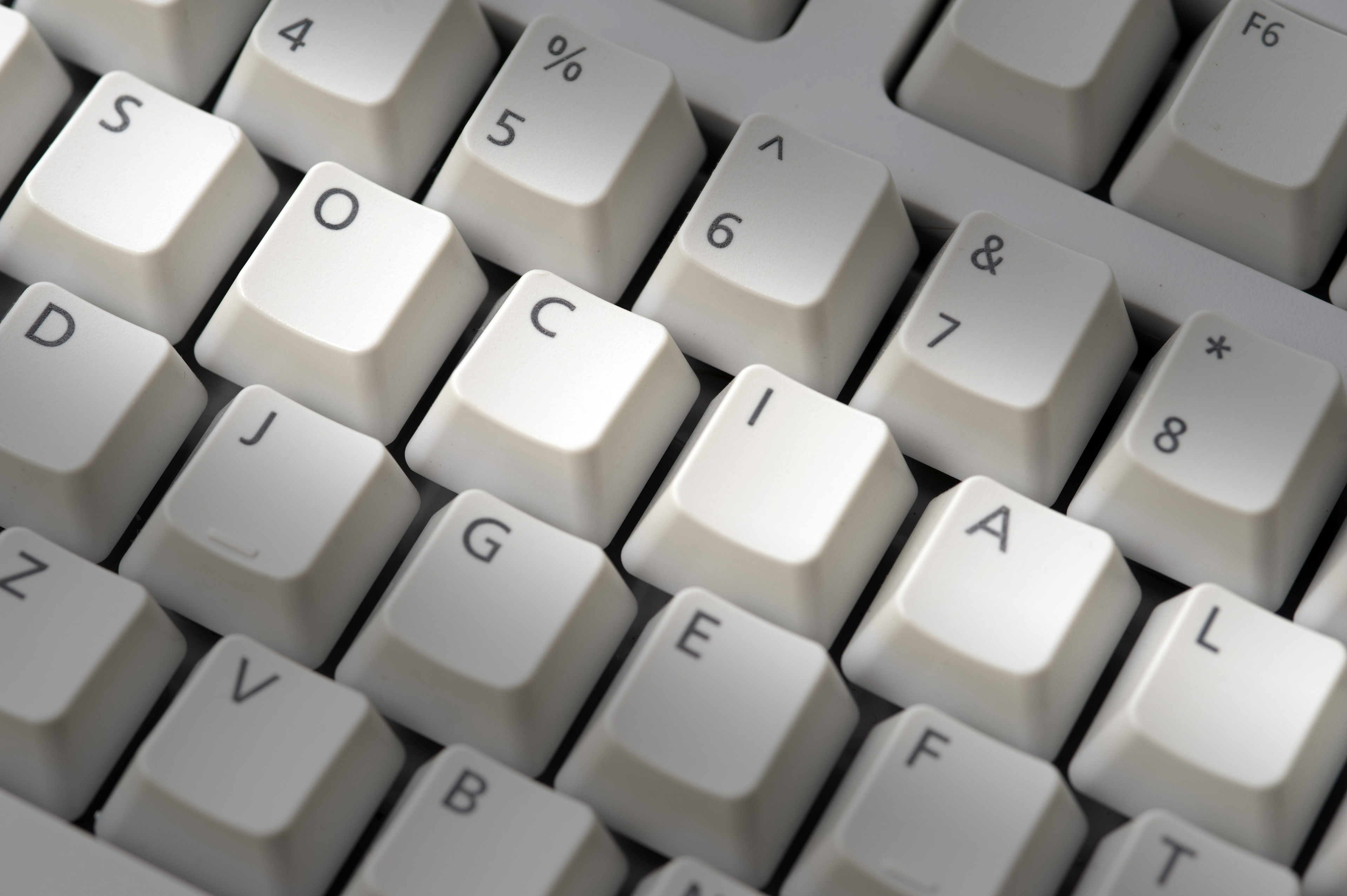 Computer key board social media concept with the letters spelling - social - highlighted in a row depicting internet or online multimedia connectivity and community sharing
