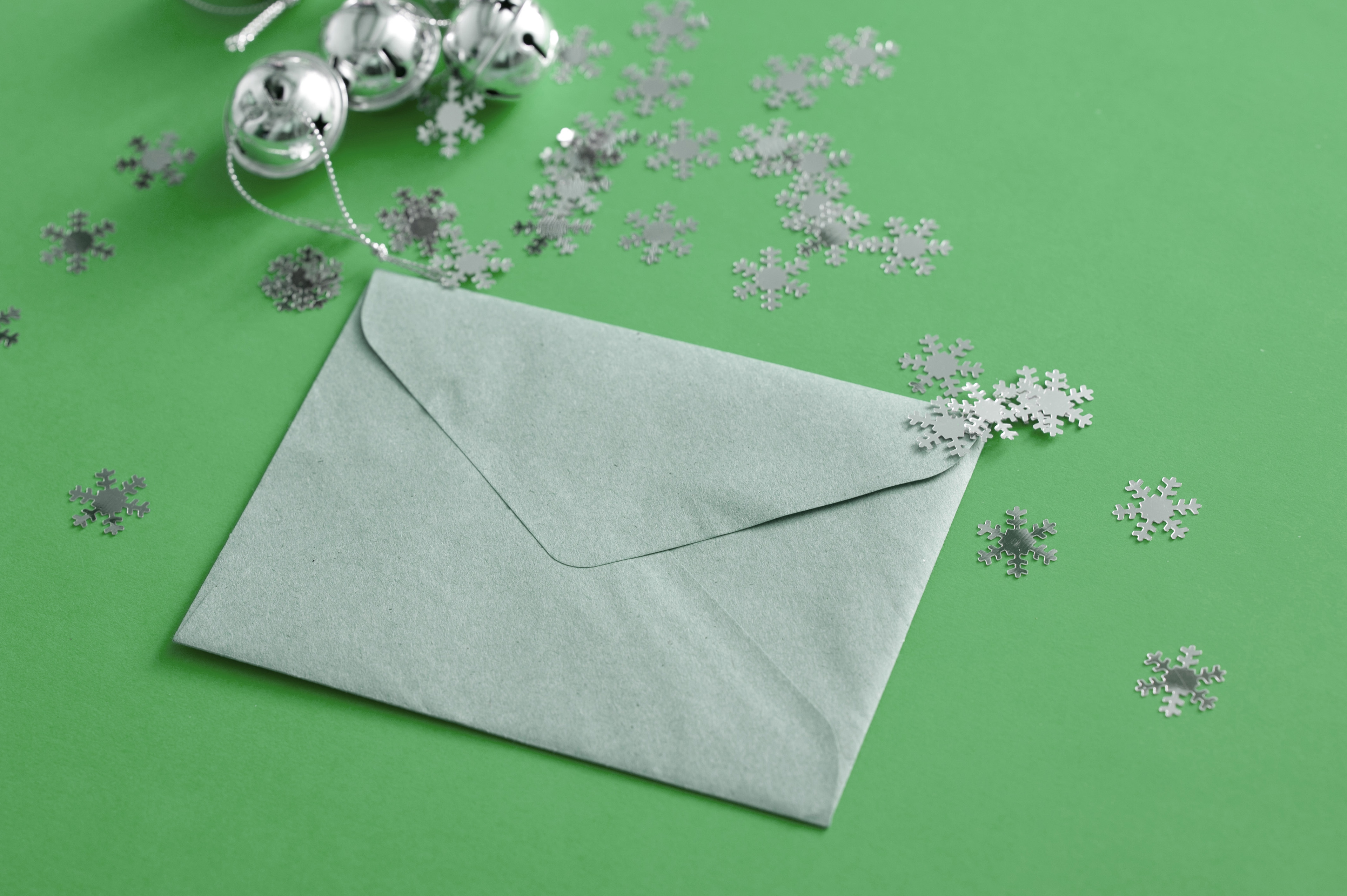 background bells celebration christmas correspondence decorations envelope holiday letter silver snowflakes green unopened festive xmas