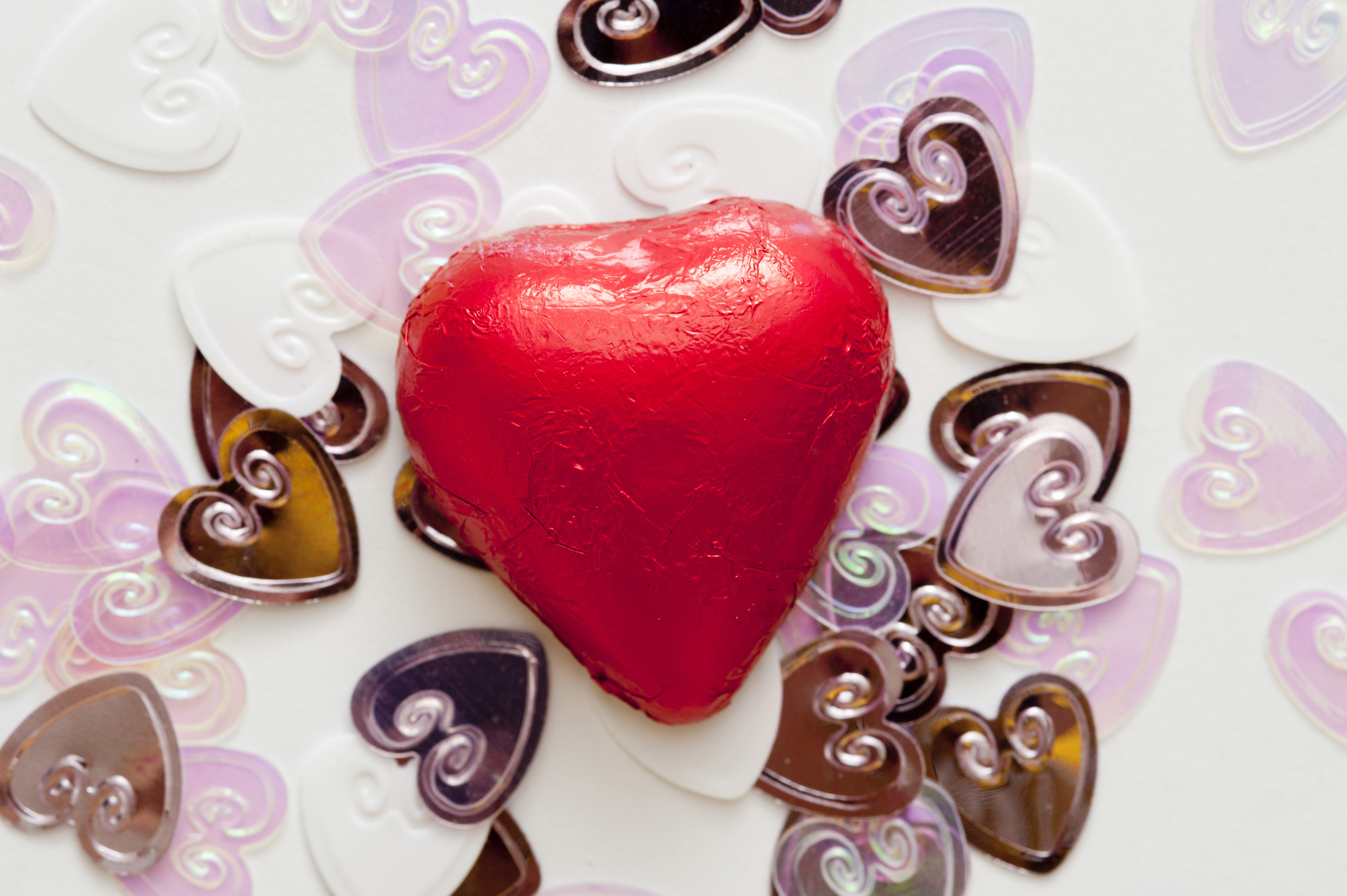 heart love romance symbolic anniversary wedding valentines candy chocolate center metallic scattered surround foil wrapped red pink