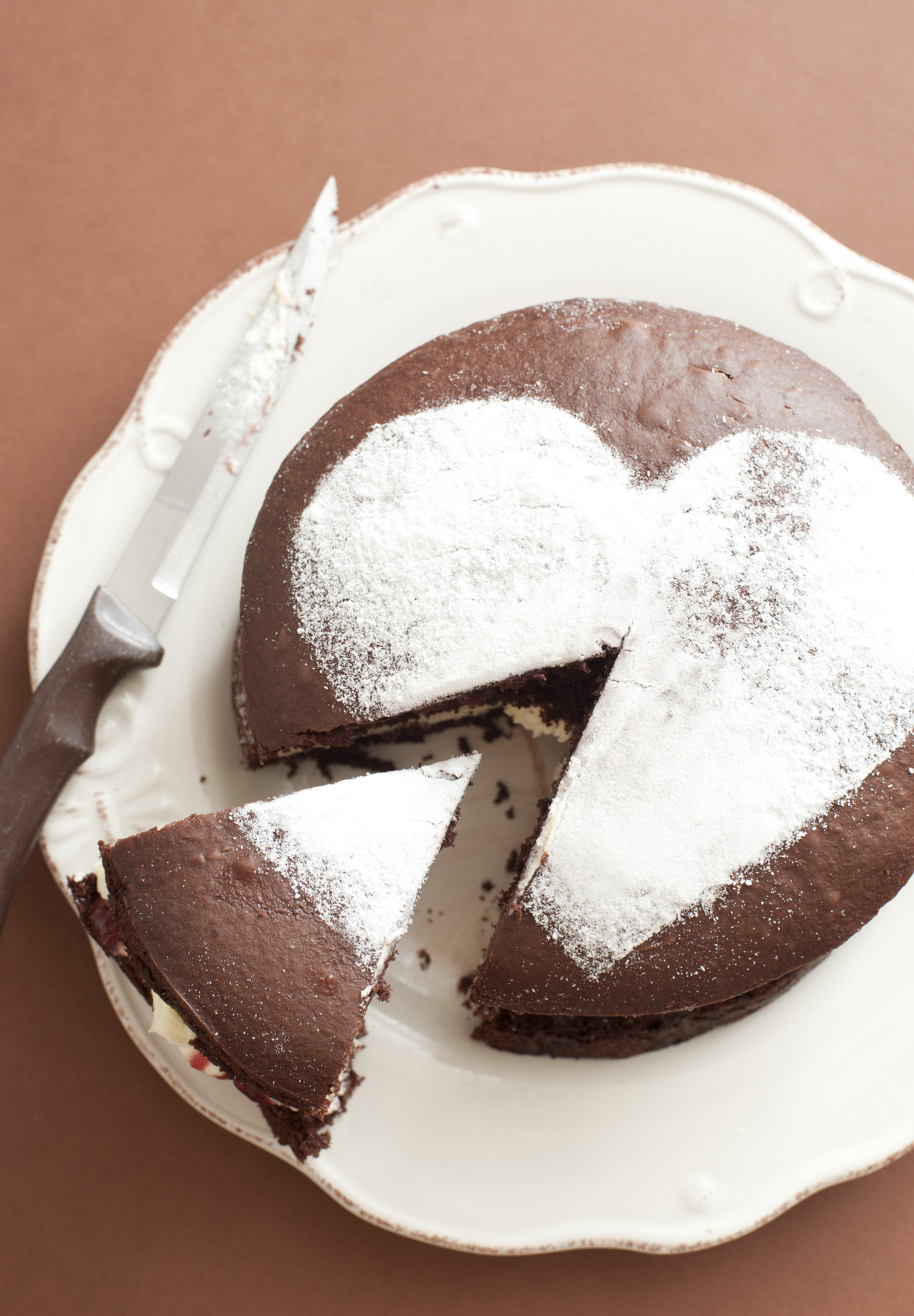birthday brown cake chocolate cut knife love piece romance slice valentine wedge confectionery high angle